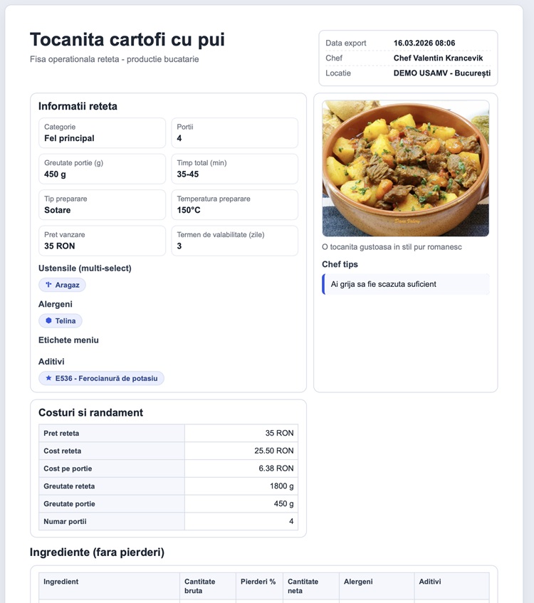 Fișele tehnice includ, într-un format standardizat, informații operaționale precum: ingredientele și cantitățile, pașii de preparare, metoda și temperatura de gătire, plating/servire, sfaturi de la chef, alergeni și aditivi, precum și indicatori de cost și randament.